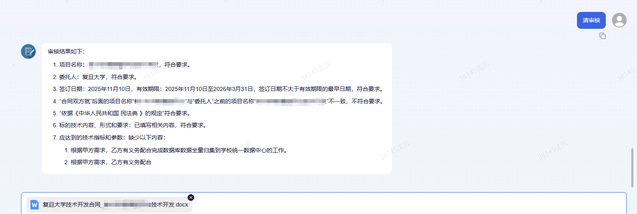 此外,用户可将技术开发或技术服务合同的初稿上传至智能体,输入“请审核”指令,智能体将依据信息化合同审核知识库,对合同内容进行逐条检查并反馈审核结果,示例如下: