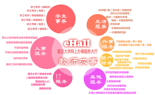 “复旦大学网上办事服务大厅(eHall)”于2015年9月正式上线,为学校师生提供审批服务事项网上申办、监督、评价等“一站式”在线服务。eHall以个人数据中心和工作流管理为基础,通过梳理和公开公共服务事务,简化和优化业务流程;通过服务“碎片化”、管理“平台化”、数据“集中化”,再造业务流程、创新服务模式,将服务与管理分离。网上办事大厅每项流程都落实到具体职能部门、办理人员,师生可以在评论栏中评价,实现了办事全过程公开透明、可追溯,加强了对职能部门的过程监管,切实提升了学校管理服务水平,真正便利了广大师生员工。
